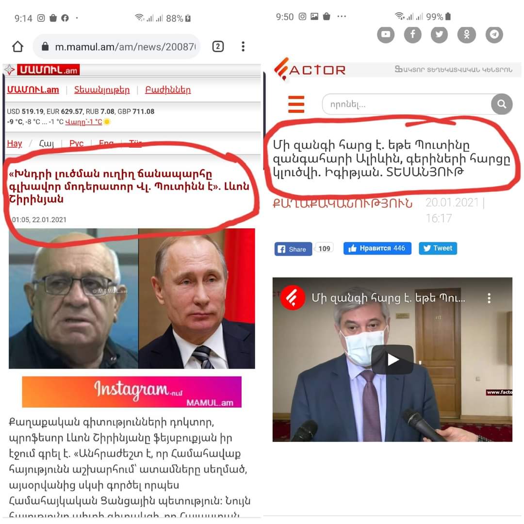 Իսկ այսօր արդեն իր կենդանական հակառուսականությամբ հայտնի և Նիկոլին անվերապահորեն ծառայող Լևոն Շիրինյանը, ով վերջին արցախյան պատերազմից 6 օր առաջ ԶԼՄ-ներից մեկին տված հարցազրույցում հայտնել էր, որ "հայն ավելի լավ է թուրքի շուն լինի, քան թե օտար պետության գործակալ", ինչպես նաև կրկին հակառուսական հռետորաբանությամբ էր հանդես եկել, գրառում է արել և "բացահայտել", որ "գերիների խնդրի լուծման ուղիղ ճանապարհը գլխավոր մոդերատոր Վլ. Պուտինն է"՝ կոչ անելով համայն հայությանը ստորագրահավաք սկսել...