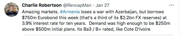 Սրան անդրադարձ է կատարել նաև Renaissance Capital-ի գլխավոր տնտեսագետը` զարմանք հայտնելով թե ինչպես է, որ Հայաստանը պարտվում է Ադրբեջանին, սակայն նրան հաջողվում է այս ծավալի և այս գնով պարտատոմս թողարկել: Իրականում մեր պետության ռիսկը շատ ավելի մեծ է քան դրան նշանակություն տվել են ներդրողները. Սրանում է զարմանքը: