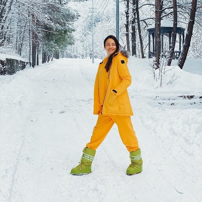 Instagram-յան էջում հրապարակված կադրերում երիտասարդ մայրիկը պատկերված է ձյունածածկ բնապատկերի ֆոնին։ Լուսինեն վառ հագուստ է կրում ու շպարված չէ։ «Ձյան օր»,- հրապարակումն անգլերենով մակագրել է նա։