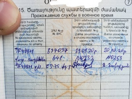 Պարզվում ա պատերազմի ժամանակ եղել եմ վարորդ ու ռադիոհեռախոսավար, բայց իրականում եղել եմ հրետանավոր հրետանային ստորաբաժանման կազմում Մարտակերտի 1-ին դիվիզիոնի 3-րդ մարտկոցում։ Չէ սա իրոք ամենավերջին ստորություն ա, Մարտակերտի զորամասի կողմից։ Ես եղբայրաբար խնդրում եմ ճիշտը գրեք, թե չէ ստիպված դատի եմ տալու` չի կարելի կռվի դաշտում մինչև վերջ մնացող մարդու հանդեպ այսպես վարվել` այն դեպքում երբ հրամանատարական կազմը բունկերից դուրս չի եկել։