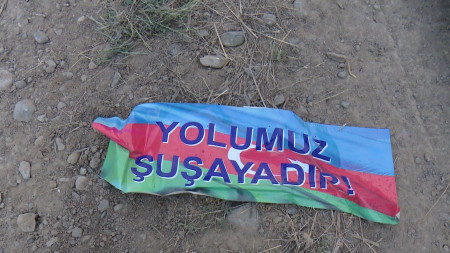 2020 թ․ սեպտեմբերի 27-ի լուսաբացին թշնամու ոչնչացված զինծառայողների վրայից առգրավված իր՝ Ադրբեջանի դրոշ՝ «Մեր ճամփեն դեպի Շուշի է» գրառումով։