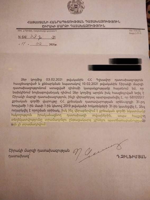 Մեզ է դիմել մի քաղաքացի և ներկայացրել Շիրակի մարզի դատախազության մի խիստ «տարօրինակ» գրություն։