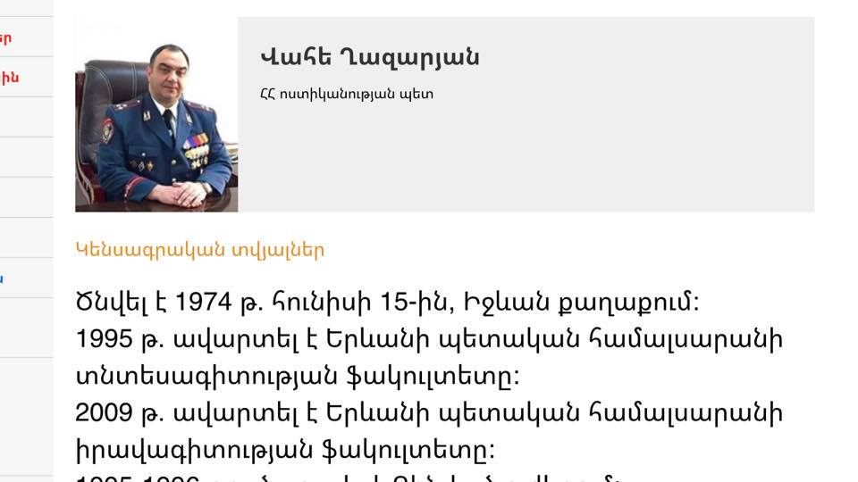Ոստիկանության, հատկապես Ներքին զորքերի հատուկ նշանակության ջոկատի այսօրվա անասնական պահվածքը, չհրահրված ագրեսիան, տեսա-ֆոտոխցիկների տեսադաշտից դուրս ոտքերով ու ծնկներով հասցված հարվածները ստիպեցին ինձ հատուկ ուշադրությամբ ուսումնասիրել այսօրվա ոստիկանապետ, դավաճան հողատուի համադասարանցի վահե ղազարյանի կենսագրությունը։