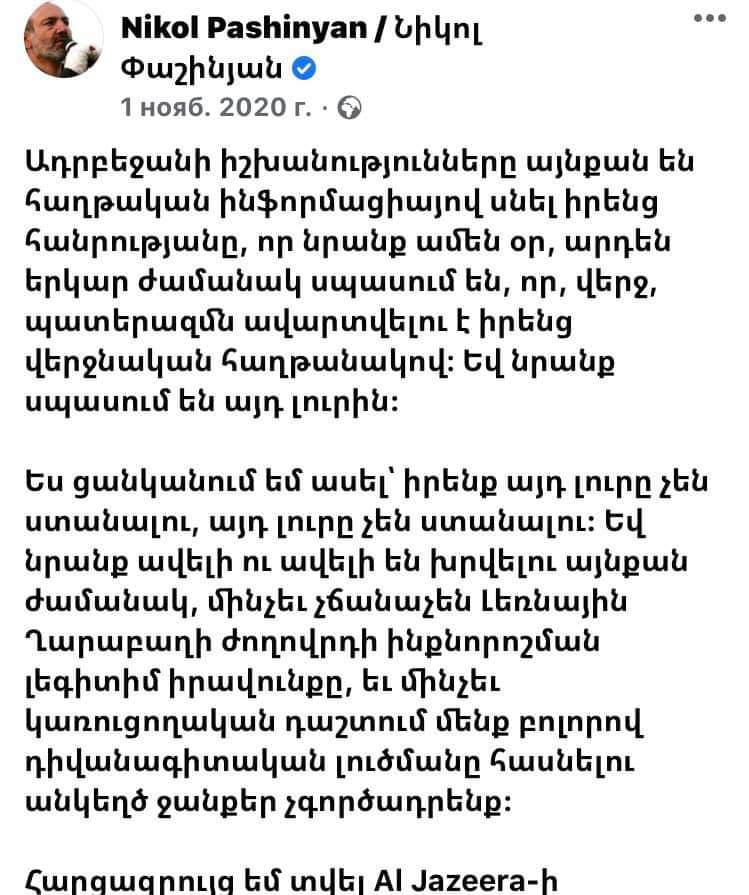 Փաստն այն է, որ այս հոխորտացող գրառումից ուղիղ 7 օր հետո Նիկոլը՝ նույն ալիևի հետ, ստորագրում է կապիտուլյացիոն հայտարարություն և զորքերը դուրս բերում բոլոր մնացյալ տարածքներից։ Իսկ ավելի ուշ հայտարարում, որ Շուշին ադրբեջանցիներինն է, իսկ Տեղ գյուղից այն կողմ՝ ընդհանրապես ադրբեջան է։