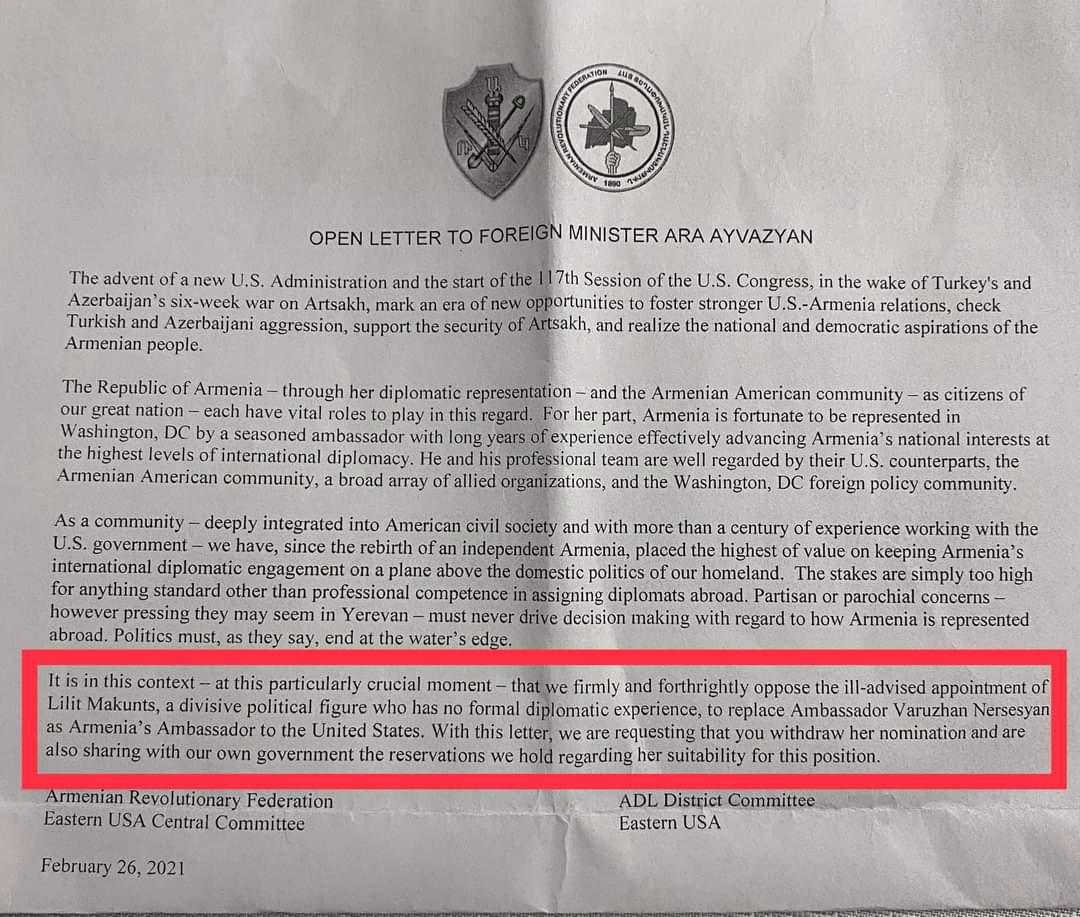 Հրապարակում եմ ինձ անանուն աղբյուրներից հասանելի դարձած նամակը՝ ԱՄՆ-ի ՀՅԴ եւ ՌԱԿ կառույցների կողմից՝ ընդդեմ Մակունցի դեսպանանշանակման։