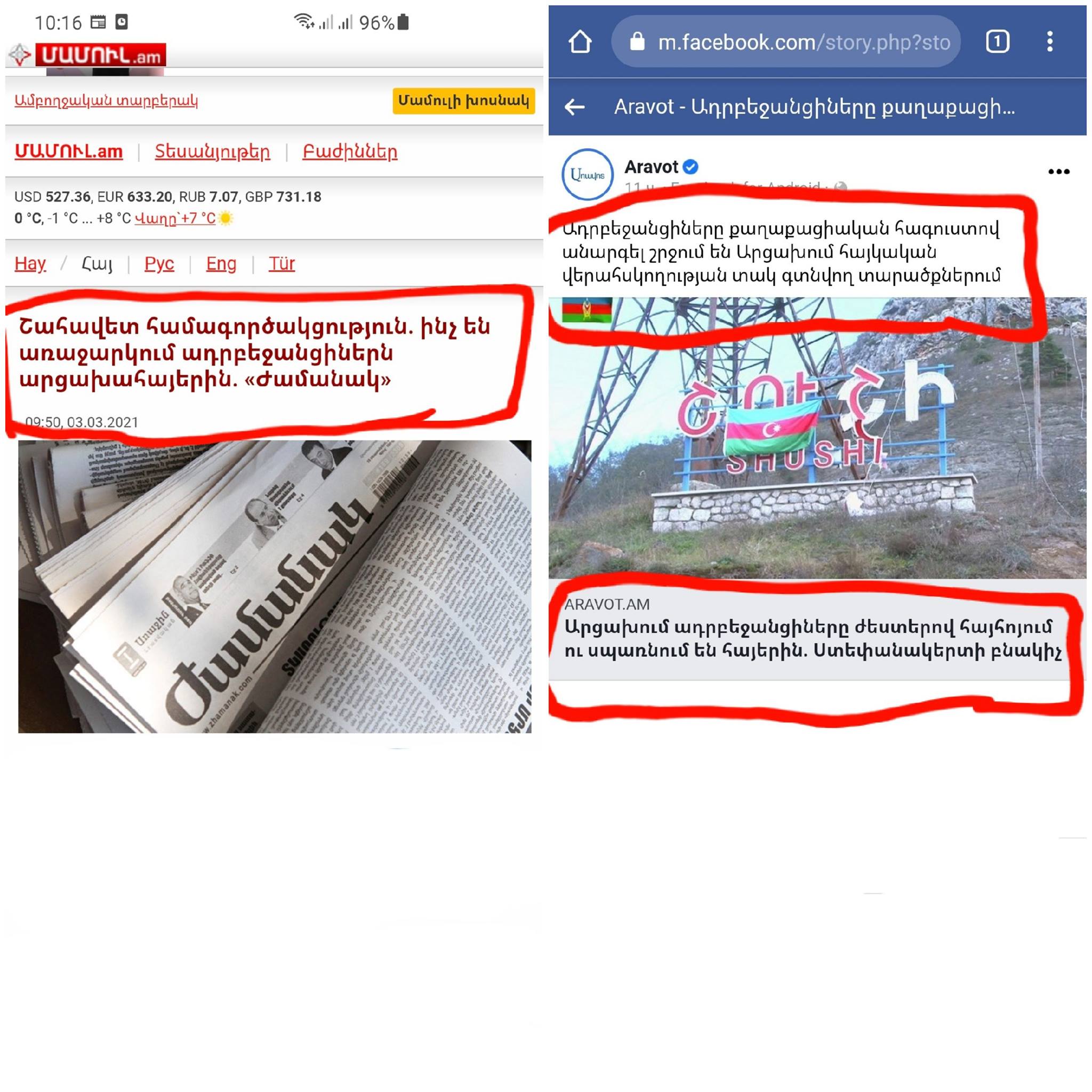 Իսկ մինչ Նիկոլին սպասարկող ԶԼՄ-ները ադրբեջանցիների կողմից հայամետ քայլերի մասին են գրում, առաջ տանում Արցախում հայերի և թուքերի խաղաղ գոյակցության գաղափարը, Ստեփանակերտի բնակիչները այլ ԶՄՆ-ներին պատմում են, թե ինչպես Արցախում ադրբեջանցիները ժեստերով հայհոյում ու սպառնում են հայերին...