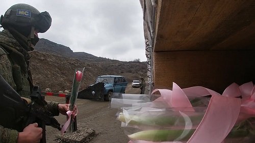 Լաչինի միջանցքի երկայնքով քաղաքացիական մեքենաների անվտանգությունն ապահովելու առաջադրանքներ իրականացնելիս դիտակետերում գտնվող ռուս զինծառայողները ծաղիկներ են նվիրել Լեռնային Ղարաբաղի բնակչուհիներին՝ նրանց շնորհավորելով գալիք մարտի 8-ի առթիվ, հաղորդում է Ռուսաստանի պաշտպանության նախարարությունը: