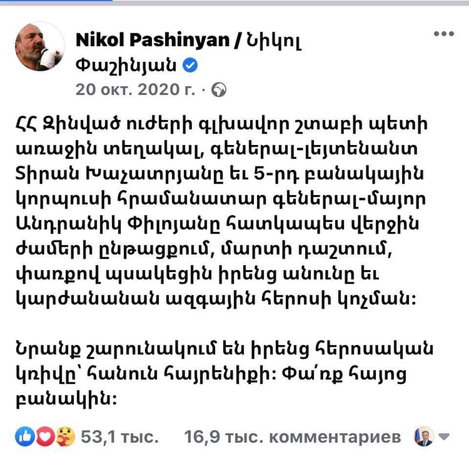 Նիկոլի այս գրառումից հետո շուրջ 5 ամիս անց, ՀՀ Ազգային հերոս Տիրան Խաչատրյանը փորձում է դատարանում վիճարկել իր պաշտոնից ազատման հրամանագիրը