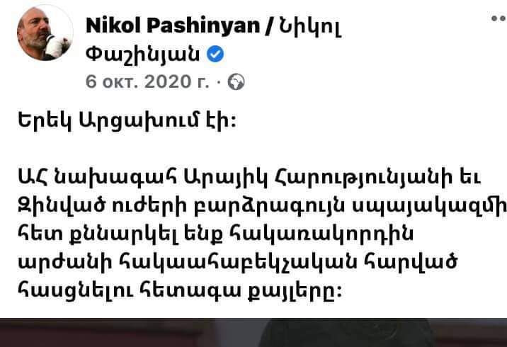 Հոկտեմբերի 5-ին կապիտուլյանտը գնացել է Արցախ՝ հակառակորդին «արժանի հակահարված հասցնելու» հետագա քայլերը որոշելու համար։ Այնինչ, նա իրականում գնացել էր տեղում հասկանալու, թե ի՞նչ է կատարվում, ու նաև իր մեղքով ի՞նչ քաոսի է վերածվել առաջնագիծը։