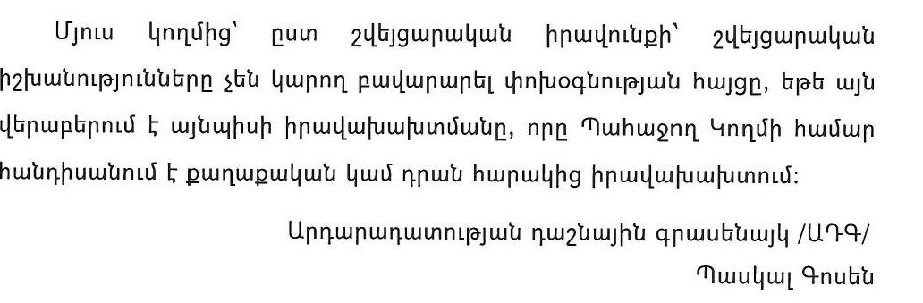 «Ըստ շվեյցարական իրավունքի՝ շվեյցարական իշխանությունները չեն կարող բավարարել փոխօգնության հայցը, եթե այն վերաբերում է այնպիսի իրավախախտմանը, որը պահանջող կողմի համար հանդիսանում է քաղաքական կամ դրան հարակից իրավախախտում»,- նշված է փոխօգնության միջնորդությանն ի պատասխան Շվեյցարիայի իշխանությունների պատասխանում։