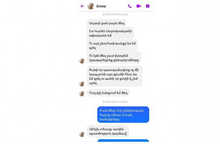 «Էս աղջիկն էսօր դեպուտատ դարձավ։ Հիշեցնեմ. Շիրակի նախկին մարզպետ, հետո դեպուտատ Կարեն Սարուխանյանի օգնականն էր, ով Արմեն Աշոտյանի նախորդ տարիների շնորհավորանքը քոփի փաստ էր արել ու սղացրել մարզպետի անվան տակ։ Ես գրել էի էդ մասին։ Խնդրում էր, որ գրառումս ջնջեմ։ Մերսի քեզ, Փաշինյան Նիկոլ»։