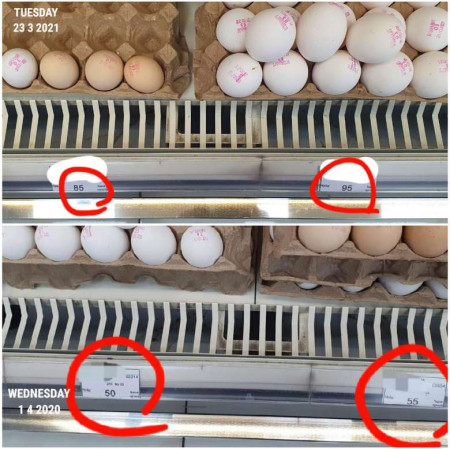Կոլաժում երկու լուսանկար է տեղադրված, որոնցից մեկն արել եմ այսօր, իսկ մյուսը՝ մոտ մեկ տարի առաջ նույն խանութի ձվի վաճառքի բաժնում...