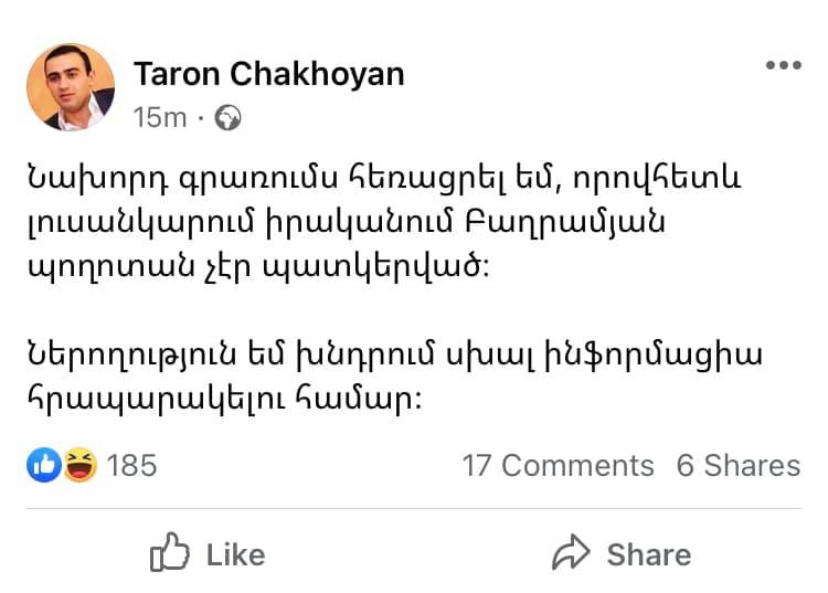 Գրառումը հեռացրել է ու ներողություն է խնդրում: Դե արի ու մի ասա, այ նիկոլի ստրուկ, ողորմելիությանն էլ չափ ու սահման կա: Չնայած ինչ եմ ասում, քո նման անհայրենիքի համար կարևորը ֆեյք նյուզը դաշտ գցելն է, ու հետո մի տող ներողությամբ ձև տալը, իբր պատահական էր...