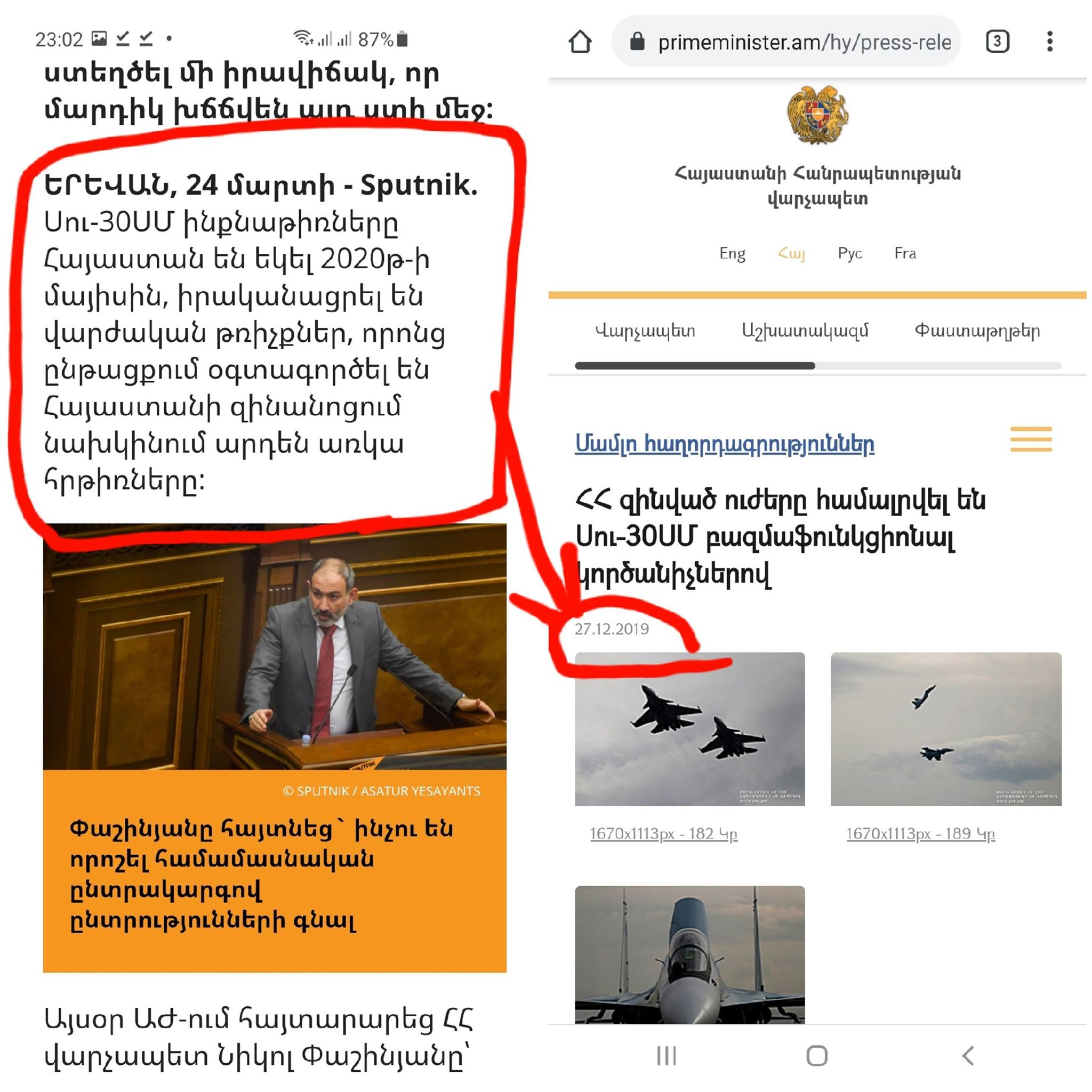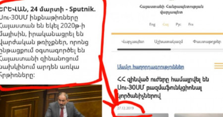 Հետաքրքիր է, ի՞սկ վարչապետի պաշտոնական կայքում 2019 թ-ի դեկտեմբերի 27-ին հրապարակված մամլո հաղորդագրությունը՝ ՍՈՒ-30ՍՄ-ների ցուցադրական թռիչքների մասին, որին ներկա են գտնվել վարչապետի աթոռին զմռսվածը, ՊՆ ղեկավարը և ԶՈՒ ԳՇ պետը ի՞նչ է... Սու՞տ տեղեկատվություն է...