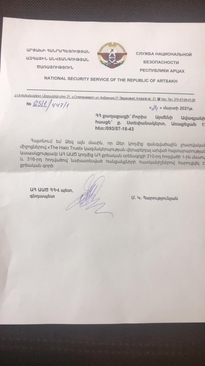 Արցախի նախագահի ներկայացուցիչ Բորիս Ավագյանին Արցախի ԱԱԾ-ից հայտնել են, որ բրիտանական «HALO Trust» ընկերության գործունեության վերաբերյալ իր հայտարարության կապակցությամբ Արցախի ազգային անվտանգության ծառայությունում հարուցվել է քրեկան գործ ԱՀ Քրեական օրենսգրքի 310՝ պետական դավաճանություն և 316 -րդ՝ լրտեսությունը հոդվածի հատկանիշներով է