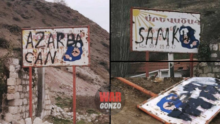 По данным проекта, 4 азербайджанских военных обошли блокпост миротворцев под Шуши и вышли на трассу, ведущую в столицу Арцаха в районе памятника с танком. Там «диверсанты» нанесли надписи на таблички и скрылись.