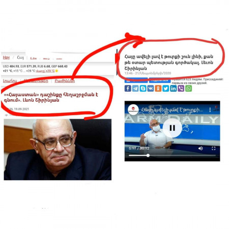 “Неудивительно, что это “животное”, которое считало, что лучше быть “собакой у турок”, нежели агентом иностранного государства (имелась ввиду Россия), так сильно встревожен… Последние шаги его кумира Никола Безземельного – просьба к премьеру Грузии организовать его встречу с президентом Турции, наконец, подарили ему надежду, что давняя мечта осуществится, и армяне станут собаками у турок… Причем, по некоторым слухам, он в довольно близких отношениях с одним из прониколовских олигархов, который, по тем же слухам, считается лоббистом номер один турецких интересов в Армении, надеясь, что наша станет каким-то образованием в подчинении у Анкары и Баку, и ему подобные займут почетные места в армянской иерархии турецких собак…