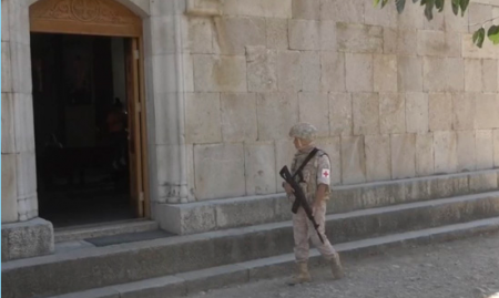Миротворцы обеспечивают безопасность паломников во время движения и посещения монастырского комплекса Амарас и во время церковной службы.
