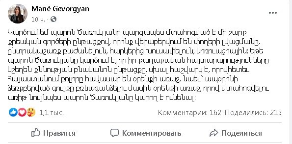Скрывающийся за спиной пресс-секретаря Пашинян еще раз доказал, что возбуждение уголовных дел или угрозы ими - чисто политический инструмент в его руках, а не установление законности или борьба с коррупцией. Тем более, что действующая власть погрязла в беззаконии и коррупции.