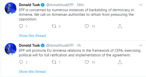 Европейская народная партия обеспокоена многочисленными случаями отступления демократии в Армении. Об этом в своем микроблоге в Twitter написал глава ЕНП, бывший председатель Европейского совета Дональд Туск.