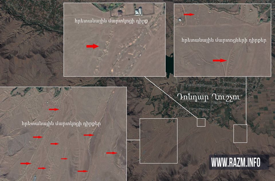 Так, на основе фотографий, сделанных со спутника, видно азербайджанское село Дондар Гушчу, расположенного в Товузском районе Азербайджана - примерно в 10 км от линии фронта, вокруг которого развернуты азербайджанские артиллерийские батареи.