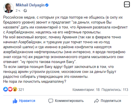 То есть, если завтра позиция Баку вдруг будет заключаться в том, что геноцид армян устроили русские, московские сми за деньги будут радостно собирать утверждающие это комменты. Не пора ли почистить медиаполяну?», - написал Делягин.