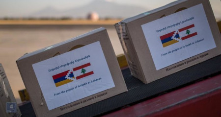 «От народа Арцаха Ливану; еще один самолет вылетел в Бейрут», - сообщили в правительстве Армении. На ящиках написано: «От народа Арцаха Ливану».