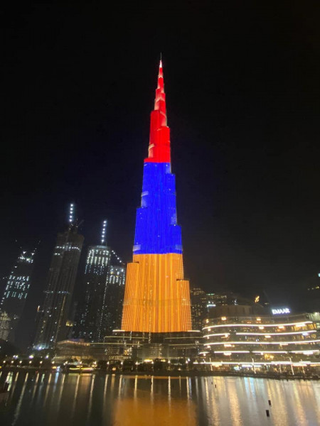 В честь Дня Независимости Армении здание Бурдж Халифа в Дубае осветили в цвета государственного флага Армении. Об этом сообщает МИД Армении.