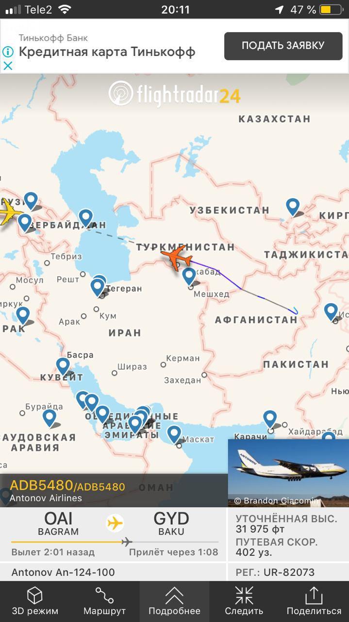 Из Афганистана в Баку летит самый грузоподъёмный самолёт в мире (карта)