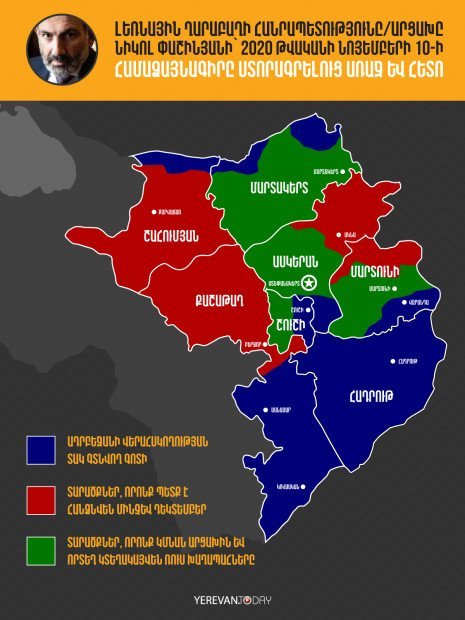 Согласно заявлению, подписанному лидерами Армении, Азербайджана и России, территория Арцаха значительно сократится. Об этом сообщил Yerevan.today, представив инфографику.