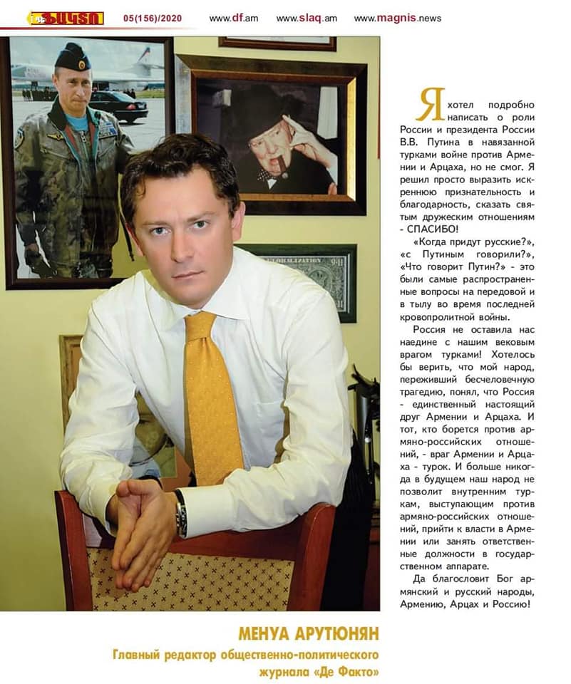 Я хотел подробно написать о роли России и президента России В.В. Путина в навязанной турками войне против Армении и Арцаха, но не смог. Я решил просто выразить искреннюю признательность и благодарность, сказать святым дружеским отношениям - СПАСИБО!