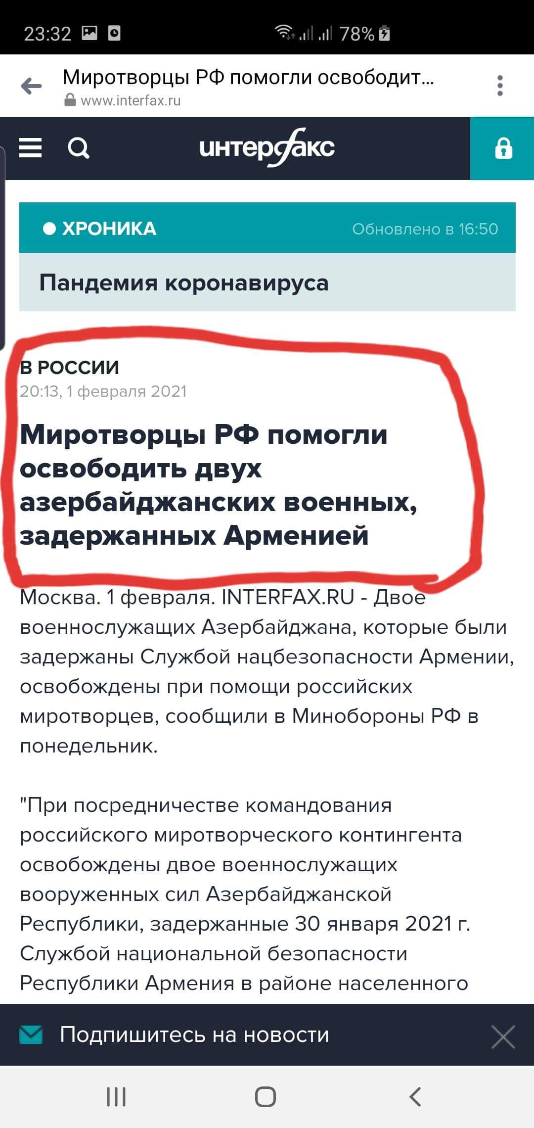 Согласно официальному сайту Минобороны России, при посредничестве командования российского миротворческого контингента двое военнослужащих ВС Азербайджана, задержанные 30 января 2021 года Службой национальной безопасности Армении в районе населенного пункта Тех Сюникской области РА, переданы Азербайджану.