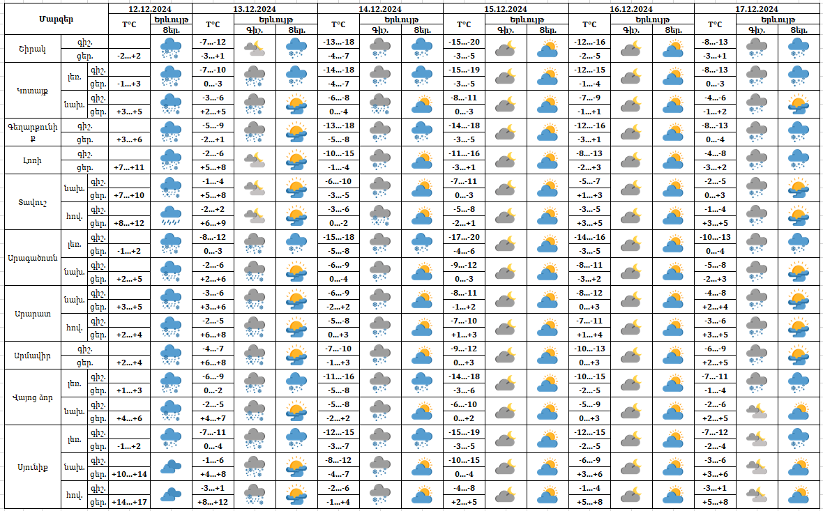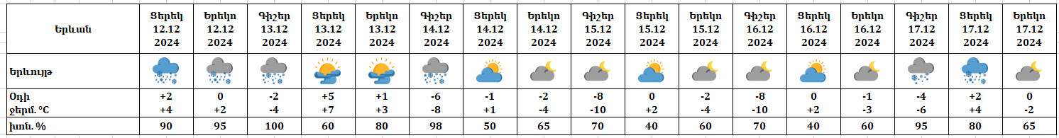 Երևանում դեկտեմբերի 13-ի և 14-ի գիշերը, 17-ին սպասվում են տեղումներ, քաղաքի բարձրադիր հատվածներում ձյան տեսքով։ Դեկտեմբերի 13-14-ի ցերեկը, 15-16-ին սպասվում է առանց տեղումների եղանակ։  Դեկտեմբերի 14-ին սպասվում է նաև քամու ուժգնացում 15-18մ/վ արագությամբ։
