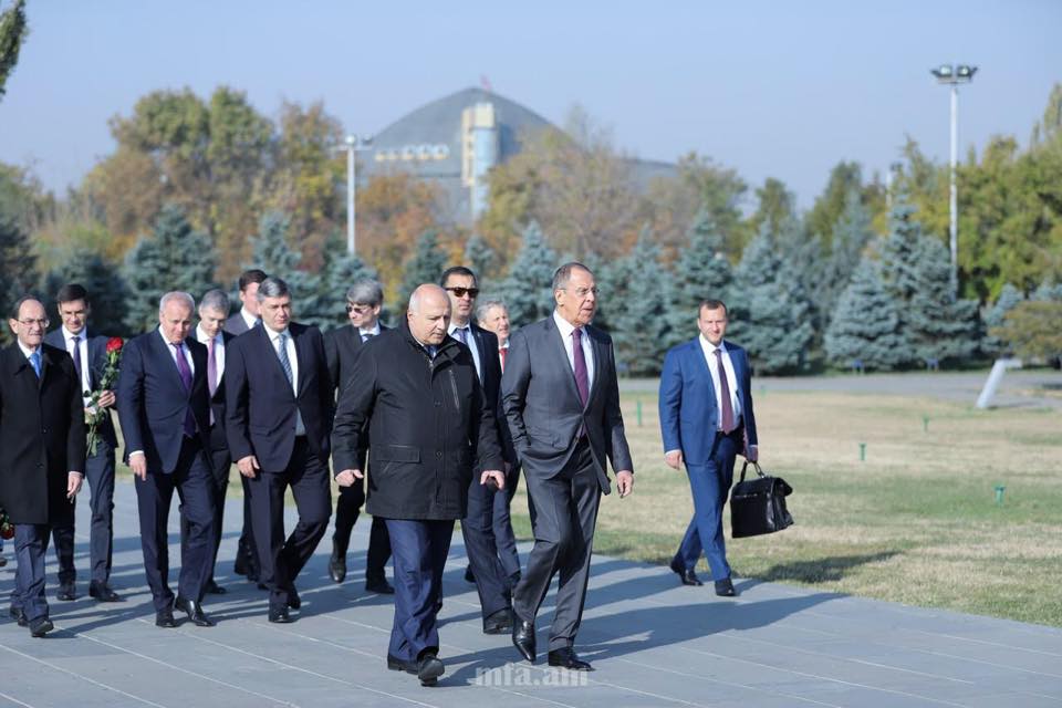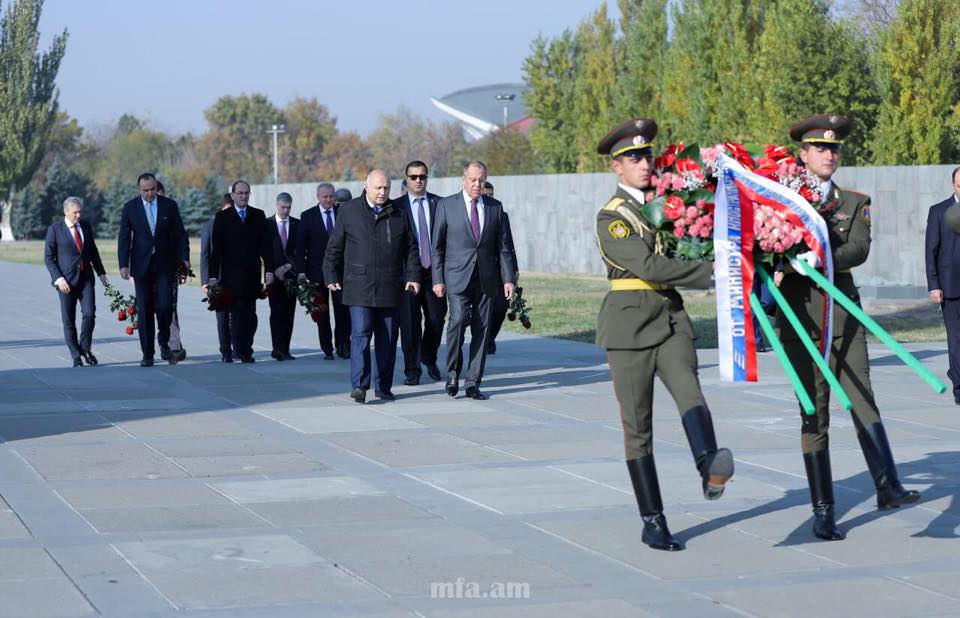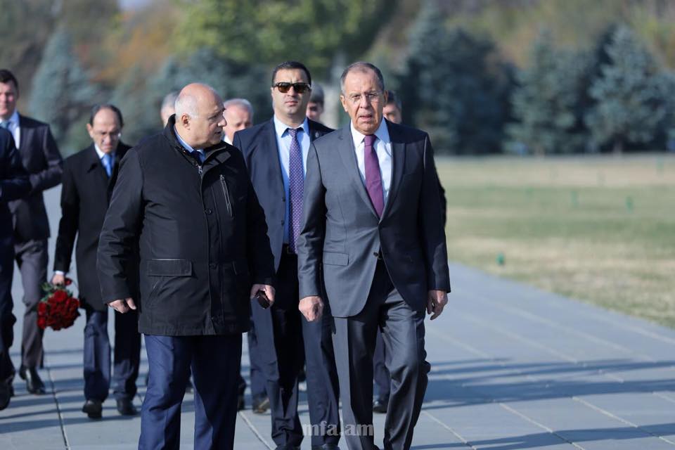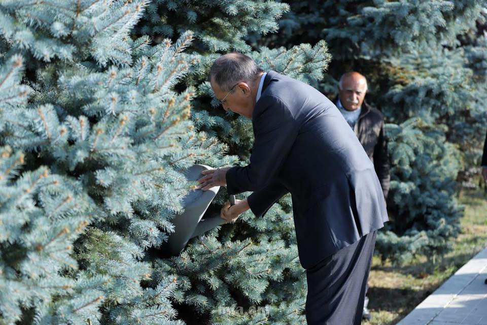 Как передает МИД Армении, министр Лавров возложил венок к памятнику жертвам Геноцида aрмян и цветы у вечного огня.
