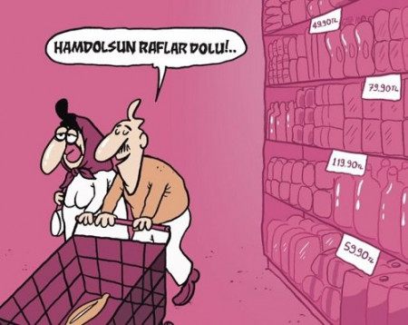 Ծաղրանկարում, սակայն, երևում է, թե ինչպես են գնումներ կատարող ամուսինները բարձր գների պատճառով զամբյուղի մեջ դնում միայն մեկ հաց և հեռանում խանութից՝ ասելով՝ «Փառք Աստծո, որ դարակները լիքն են»։