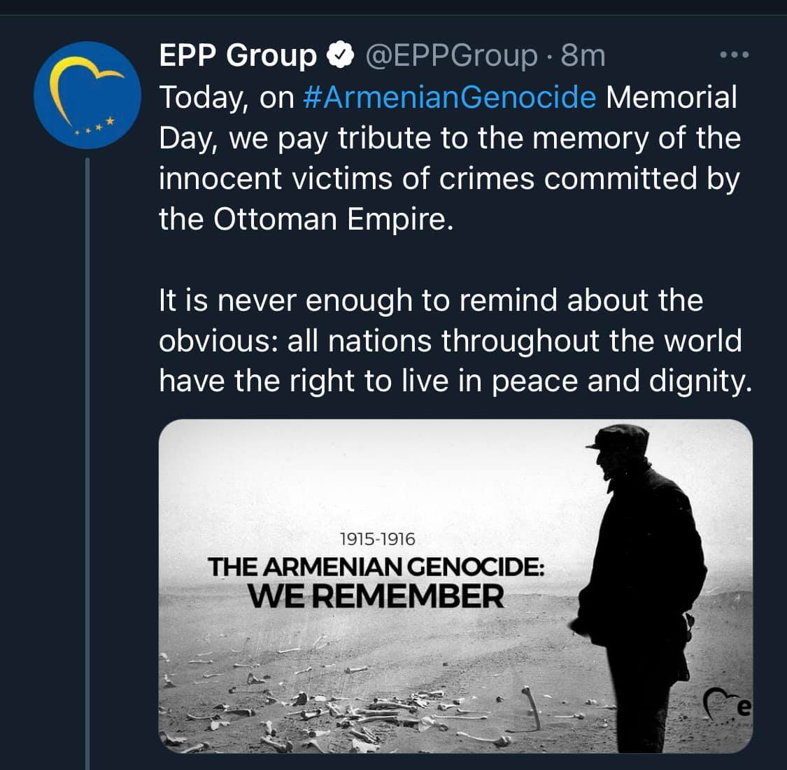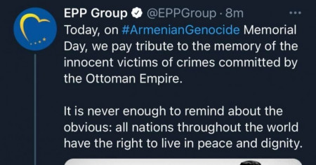 Եվրոպական ժողովրդական կուսակցության խմբակցությունը իր թվիտերյան էջում անդրադարձել է Հայոց ցեղասպանության 106-րդ տարելիցին