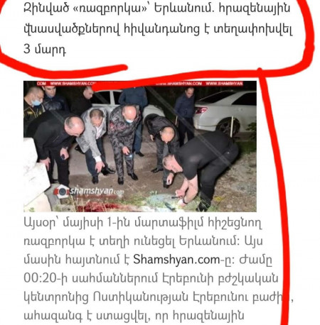 Ըստ լրատվամիջոցների, Երևանում զինված «ռազբորկա» է տեղի ունեցել, որտեղից հրազենային վնասվածքներ ստացածներին հիվանդանոց տեղափոխողների մեջ են եղել Երևանի Շենգավիթի և Մալաթիայի թաղապետերը...