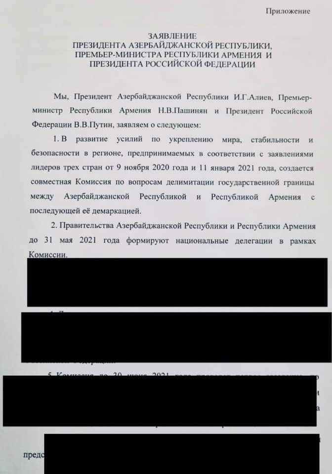 3.դելիմիտացիայի վերաբերյալ եռակողմ փաստաթուղթը, ինչպես նաև այդ գործընթացի իրականացումն անմիջապես հետպատերազմյան շրջանում, երբ հայկական կողմը և հասարակությունն ունի պարտված հոգեբանություն, իսկ Ադրբեջանն իրեն դրսևորում է որպես անզիջում մաքսիմալիստ, որևէ դեպքում հաշվի չեն առնվելու հայկական կողմի շահերը: