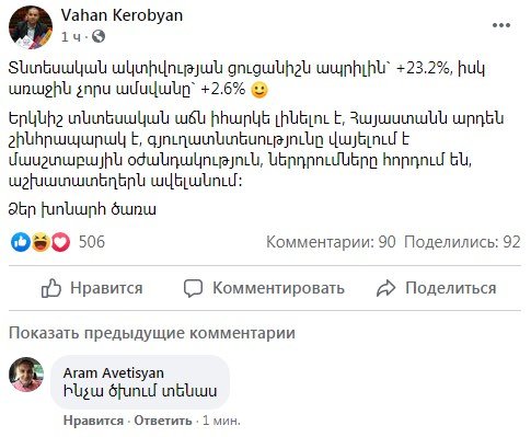 Էկոնոմիկայի նախարարը գրառում ա արել, որի տակ եղած մեկնաբանություններից Facebook-ը ընտրել ու ցույց ա տալիս ամենողջամիտն ու ռելևանտը՝ ԻՆՉ Ա ԾԽՈՒՄ: