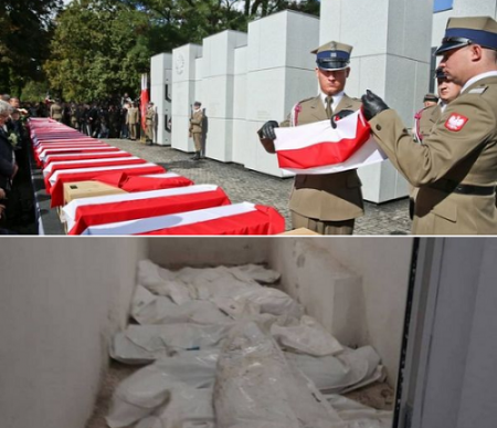 Մի լուսանկարում պատկերված է 2015 թվականին Վարշավայի զինվորական Պանթեոնում ավելի քան 70 տարի առաջ զոհված լեհ զինվորականների մասունքների հուղարկավորության արարողություն, որին մասնակցել են Լեհաստանի վարչապետը, Ազգային պաշտպանության նախարարը, բարձրաստիճան այլ այրեր։