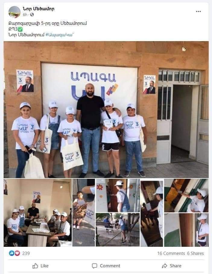 Ընտրությունների վերահսկման կոմիտեի դիտարկումները ցույց են տալիս, որ «Քաղաքացիական պայմանագիր» կուսակցությունն իր նախընտրական քարոզչությանը համակարգված ձևով ներգրավում է երեխաների։