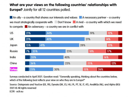 Այն հարցին, թե «ինչպե՞ս կբնորոշեք Եվրոպայի հետ Թուրքիայի հարաբերությունները», եվրոպացիների մեծամասնությունը (ավելի քան 40%-ը) պատասխանել է «թշնամական» (ընդհանուր հարցվածների 26%) կամ «հակառակորդ» (ընդհանուր հարցվածների 15%), և միայն հարցվածների 4%-ն է նշել, որ Թուրքիան «դաշնակից երկիր է, որի հետ եվրոպացիները կիսում են ընդհանուր արժեքներ»։ Սա այն դեպքում, երբ այս հարցմանը չեն մասնակցել Հունաստանի և Կիպրոսի բնակիչները (այդ դեպքում թշնամու ընկալման ցուցանիշը շատ ավելի բարձր կլիներ)։