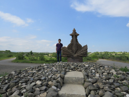 Լուսանկարում Ֆիզուլու մուտքի շրջադարձում տեղադրված պատերազմախաչքարի մոտ