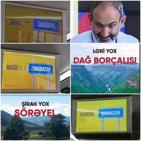Ի՛սկ ինչպես պատասխանեց Բաքուն Նիկոլի այս թրքամետ քծնանքին և Ալիևի հաստ աղիքում տեղավորվելու հերթական փորձին... Մի քանի օր անց Բաքվի հասարակական տրանսպորտում տեղադրված էկրանների վրա ադրբեջանական իշխանությունները Հայաստանի տարածքում գտնվող քաղաքները և մարզերը թուրքական անուններով էր ներկայացնում, օրինակ՝ հորդորելով քաղաքացիներին այսուհետ չասել Շիրակ, այլ ասել Շոռեյել, Լոռին՝ Բորչալիսի, Սյունիքը՝ Զանգեզուր, Մասիսը՝ Զանգիբասար, Վարդենիսը՝ Բասարգեչար և այլն...