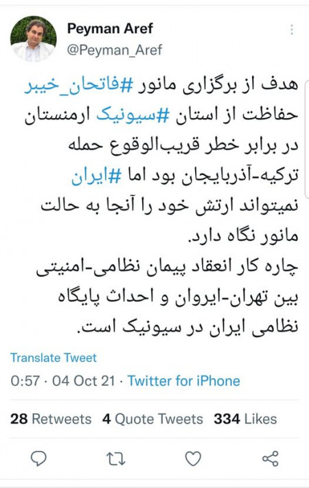 Իրանցի հայտնի լրագրող և սոցցանցերում կարծիքի առաջնորդ Փեյման Արեֆը թվիթերյան գրառման մեջ իրանական զինուժի վերջին զորավարժության պատճառ է դիտարկել Հայաստանի Սյունիքի մարզի նկատմամբ թուրք-ադրբեջանական զինված հարձակման վտանգը։