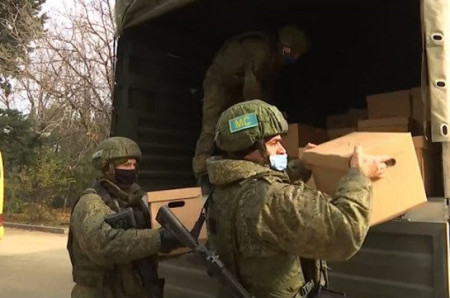 Հումանիտար բեռը Ռուսաստանից Լեռնային Ղարաբաղ է հասցվել ռուսական խաղաղապահ զորախմբի կողմից։ Տարվա ընթացքում անցկացվել են ավելի քան 226 մարդասիրական միջոցառումներ, այդ թվում՝ ավելի քան 80 խոշոր մարդասիրական ակցիաներ բնակավայրերում, դպրոցներում, մանկապարտեզներում եւ գիշերօթիկ հաստատություններում, ինչպես նաեւ ավելի քան 100 անգամ նպատակային մարդասիրական օգնություն է ցուցաբերվել Լեռնային սահմանազատման գծի երկայնքով հեռավոր վայրերում։