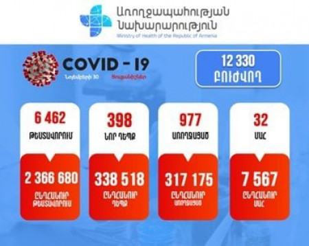 Հայաստանում նոյեմբերի 30-ին՝ ժամը 11:00-ի դրությամբ նոր կորոնավիրուսով վարակվելու 398 նոր դեպք է գրանցվել, վարակվածների ընդհանուր թիվը հասել է 338518 դեպքի: Այս մասին հայտնեցին ՀՀ ԱՆ հիվանդությունների և վերահսկման և կանխարգելման ազգային կենտրոնից: Ընդհանուր թեստերի թիվը կազմում է 2366680 վերջին մեկ օրում` 6462 նոր թեստավորում:
