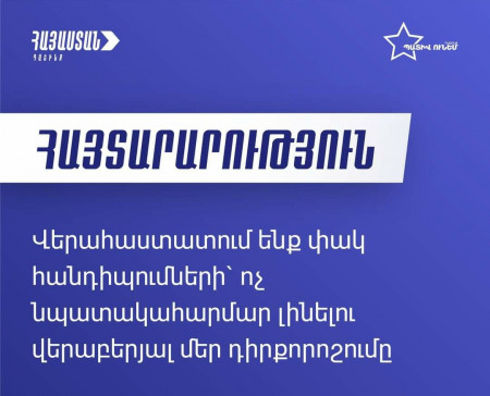 Փակ հանդիպման ձևաչափը հայ ժողովրդին առնչվող հարցերի վերաբերյալ առհասարակ անընդունելի է, իսկ Նիկոլ Փաշինյանի հետ նման ձևաչափով հանդիպման վերաբերյալ նախկինում արդեն իսկ տարածվել է հայտարարություն: Ընդդիմադիր խմբակցությունները հայտնել են, որ հանդիպման կմասնակցեն բացառապես բաց, հավասար և ժողովրդի առջև հաշվետու պայմաններում, ինչը մերժվել է, հետևաբար վերահաստատում ենք փակ հանդիպումների՝ ոչ նպատակահարմար լինելու վերաբերյալ մեր դիրքորոշումը։