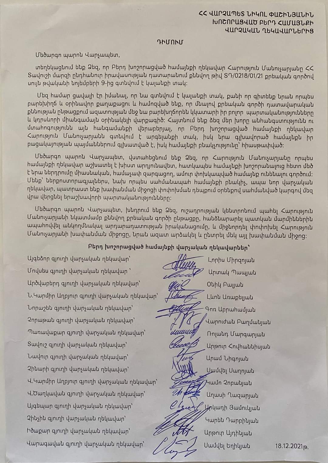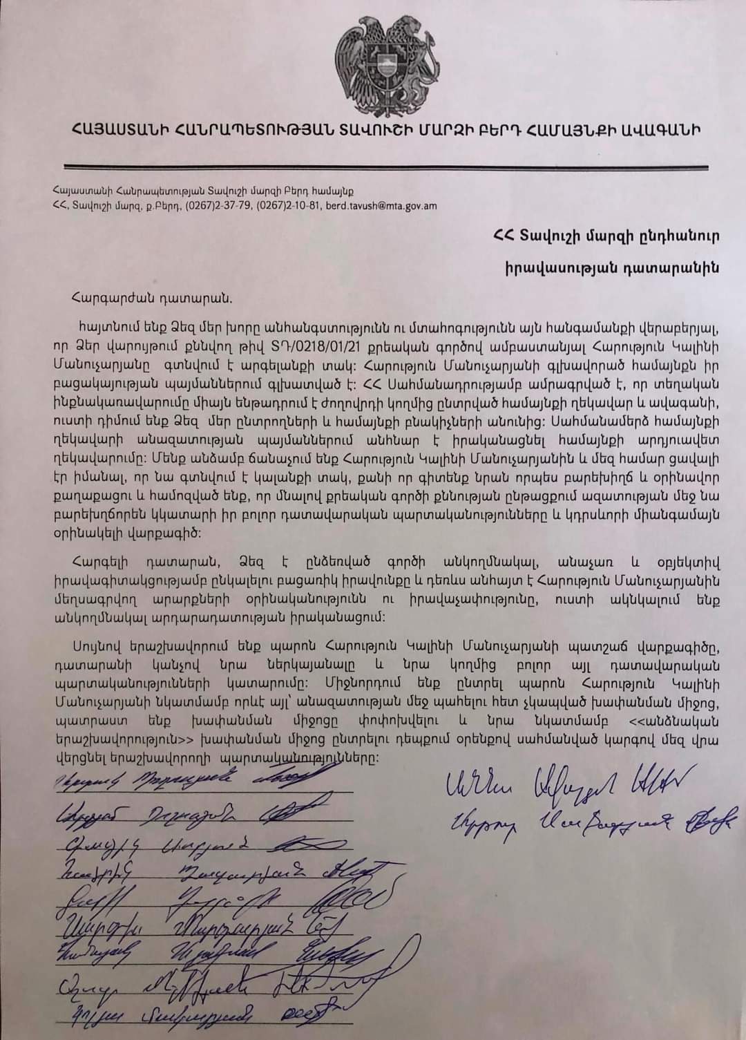 Բերդ համայնքի ավագանին դիմել է ՀՀ Տավուշի մարզի ընդհանուր իրավասության դատարանին, Բերդ համայնքի բնակավայրերի վարչական ղեկավարները՝ ՀՀ վարչապետ Նիկոլ Փաշինյանին՝ Բերդ համայնքի ղեկավար Հարություն Մանուչարյանի խափանման միջոց կալանքը երաշխավորության փոփոխելու խնդրանքով՝ պատրաստակամություն հայտնելով խափանման միջոցի փոփոխման դեպքում հանդես գալ անձնական երաշխավորությամբ։ Այս մասին տեղեկանում ենք Բերդի համայնքապետարանի տարածած հաղորդագրությունից։