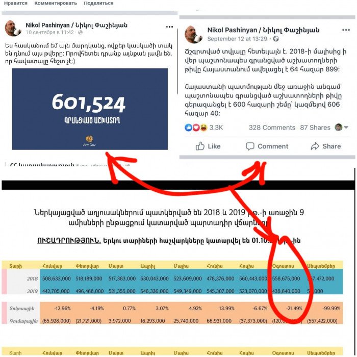 Հիշեցնեմ, որ 2019 թ-ի սեպտեմբերի 10-ին և 12-ին Նիկոլ Անհողն իր ֆեյսբուքյան էջում աշխատատեղերի վերաբերյալ գրառումներ էր արել, ըստ որի պարզվում էր, որ 2 օր տարբերությամբ Հայաստանում աշխատատեղերի թիվն ավելացել է 4516-ով... Իսկ մինչ Նիկոլն այսպիսի թվերի մասին էր խոսում, «Զինծառայողների ապահովագրության» hիմնադրամի տնօրենի հաշվետվությունից պարզվում էր, որ 2019 թ-ի օգոստոսի 31-ի դրությամբ Հայաստանում կա 438 640 աշխատատեղ, այլ ոչ թե 601 հազարից կամ 606 հազարից ավելին ինչպես ներկայացնում էր Նիկոլը ... Այս ամենը բացահայտվելուց հետո կապիտուլյանտ Նիկոլը ջնջեց կամ փակեց իր 2019 թ-ի սեպտեմբերի 10-ի և 12-ի՝ աշխատատեղերին վերաբերող այդ երկու գրառումները՝ փաստացի ընդունելով, որ կեղծել է տվյալները...